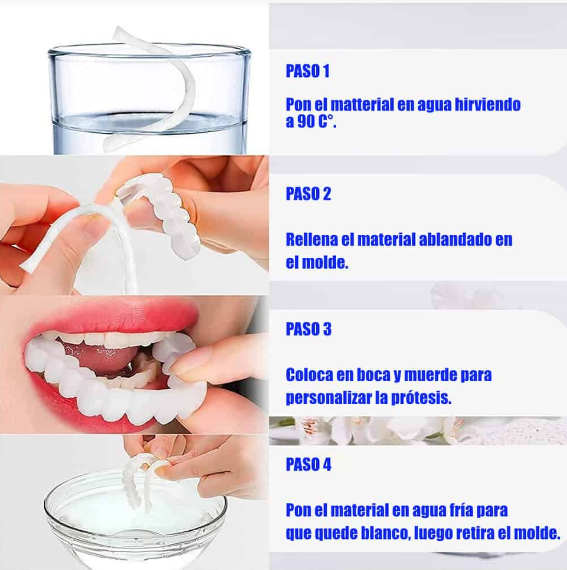 Fabricadas con materiales de alta calidad, este producto transforma sin esfuerzo los dientes perdidos, irregulares o dañados en unos dientes impecable blancos. ¡Olvídate de los procedimientos dentales costosos o visitas dentales inconvenientes!